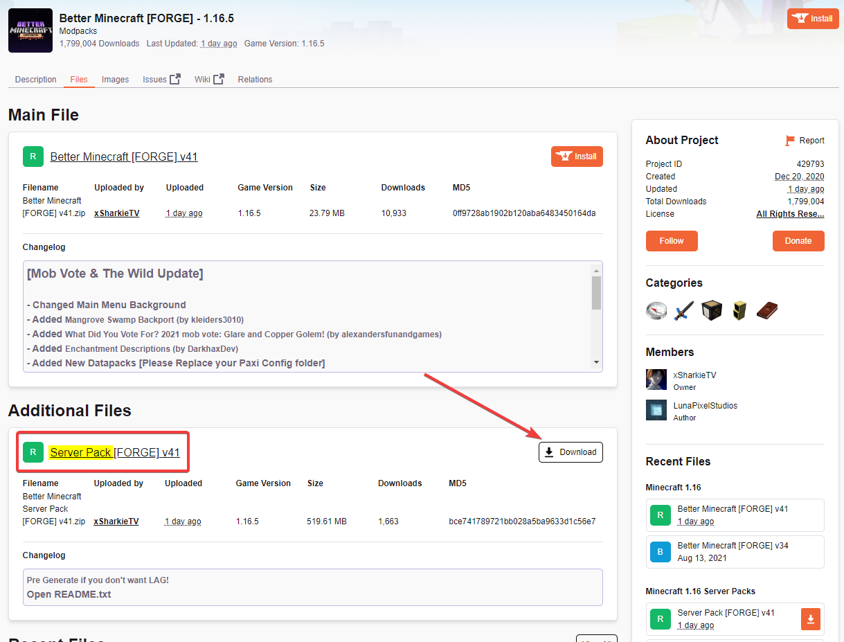 After selecting the modpack, click on the Files tab and scroll down to the "Additional Files" section. Here you will usually find the serverpack version of the modpack. This is the file we need, so click on the download button.